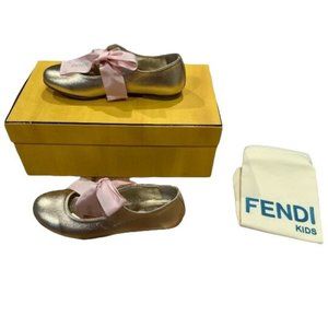 Fendi Kids Lace Up Ballet Flats Gold and Pink Ribbon Oro Chiaro Size 32 1 Girls
