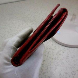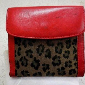 Fendi, leopard print canvas in browns and blacks and red leather, snap close, bi-fold wallet with a snap close change purse on one side, lots of slots and gold hardware! 4.75" x 4.5" x 1.75"; 2810 01695078. Wear consistent for vintage item. Please see photos for more details. All measurements are approximate. Item #: 24969908.