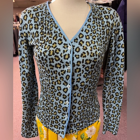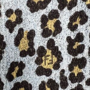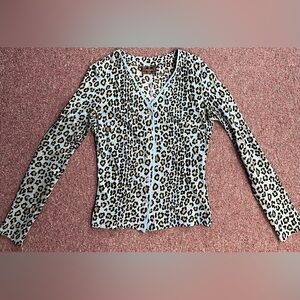 Chic Fendi cardigan featuring a leopard print. Accented with light blue trim and button-up front.