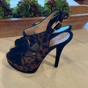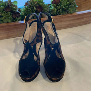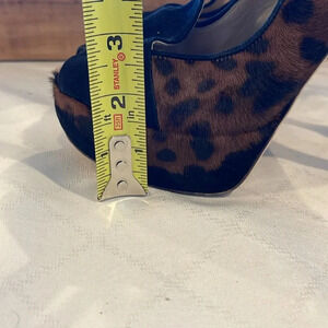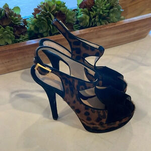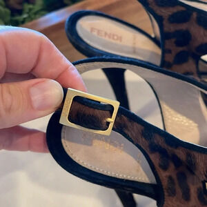 Stylish Fendi heels with leopard print. Features black accents and a sleek design. Perfect for a bold look.