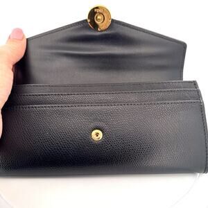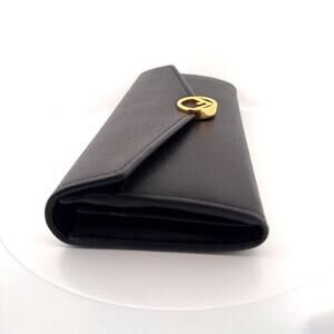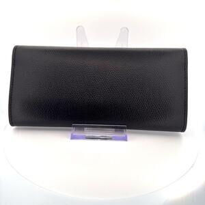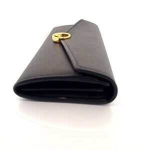A refined essential from the Italian fashion house, this authentic Fendi Continental Wallet is crafted from black textured leather and finished with the brand’s signature gold circular “F” logo clasp. The envelope-style flap opens to reveal a spacious interior with multiple compartments, card slots, and a secure coin pocket. Equal parts modern and timeless, it’s the perfect balance of elegance and practicality.