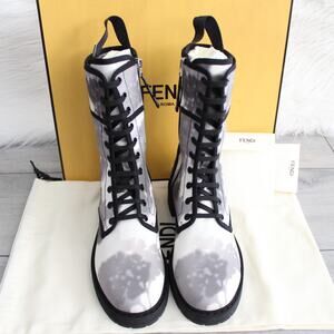 Fendi Floral-Print Canvas Spellout Logo Biker Boots with FF logo detailing