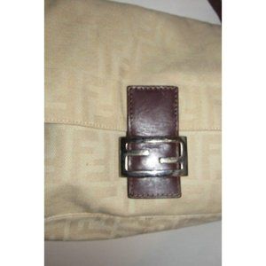 I think this style by Fendi is called a 'Mamma Zucco'. The bag is a medium/ large, classic, shoulder style purse. It is made of an ivory and tan large 'FF' logo design throughout the heavy canvas fabric. The purse has brown leather as the strap and wide snap closure with a chrome FF accents. It has one main compartment with an interior zip pocket. The lining is brown fabric and it is very clean.