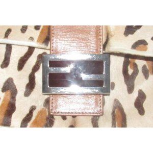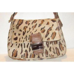 I think this style by Fendi is called a 'Mamma Zucco'. The bag is a medium/ large, classic, shoulder style purse made from black and brown leopard print on beige pony hair and brown leather with chrome hardware The clasp is the traditional chrome 'FF' style with dark brown enamel and all of the hardware is engraved 'FENDI'.
