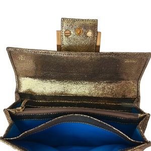 Shimmery golden fabric Zucca print with distressed gold leather trim.
