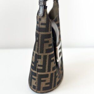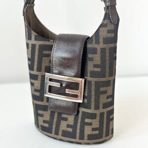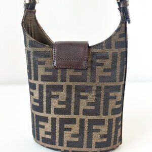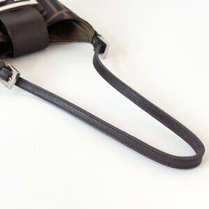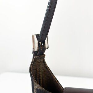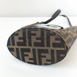 Fendi Mini Zucca Canvas Bag. The bag features dark chocolate brown leather shoulder strap and polished silver hardware. The bag opens up to a small compartment with a small pocket inside.