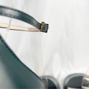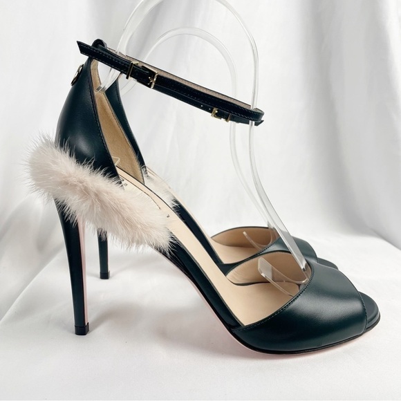 Open toe, ankle buckle closure, mink fur trim, leather, metal hardware logo, stiletto heel. Dark green. Cocktail, party, formal, evening, designer, holiday, Christmas.