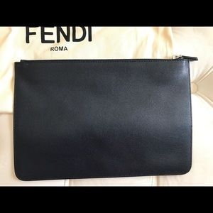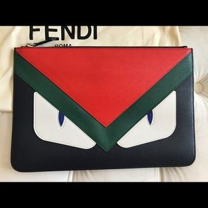 100% brand new and authentic. This black calf leather and metal top zip clutch bag from Fendi features a top zip closure, palladium tone metal, a main internal compartment, an internal slip pocket, an internal logo patch and white inlays with metal studs at the front to recreate the Bag Bugs eyes. Size: Length:11.4 inches