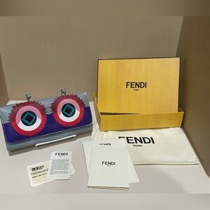 Fendi wallet with bold eye motif. Features striking colors and unique design, with the monster face. The wallet is in used condition and has wear to mainly the exterior in the forms of paint wear and corner and side rubs as pictured. Snap and zipper works fine. Fairly clean on interior. Comes with box, dustbag and cards. Do not expect perfection when ordering from me as I state the condition and picture it quite well. You will be wasting my time and yours. Serials and measurements in photos as well. Thanks for looking!