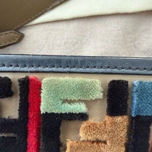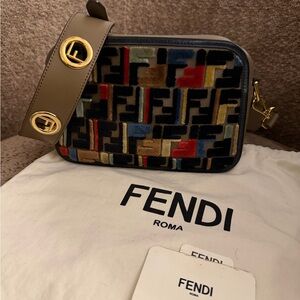 RARE Fendi Kan camera bag with multicolor Fendi logo detail in taupe leather and Fendi logo in shaved mink. A stunner! Features long strap and gold accents. Perfect for every day wear and fits your iPhone pro max, long wallet, makeup and more! Comes with dust bag. Great pre loved condition with some corner wear and normal hardware gold loss. There is one light blue F that could use some cleaning.