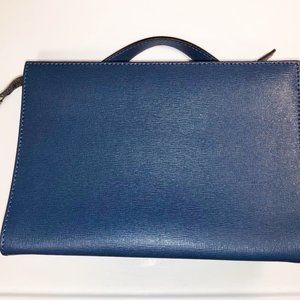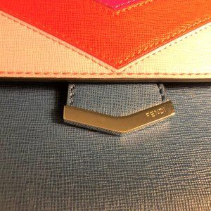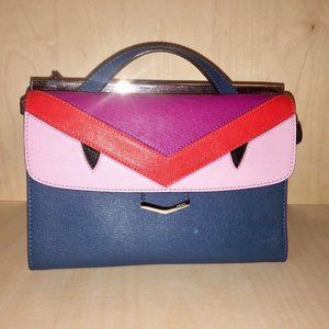 Fendi Demi Jour Monster Bag. Blue Multi Color calfskin leather. Top handle & removable strap. Frame bar separates different compartments, one w/ zipper closure & other w/ front flap closure. 1 zip & 1 open pocket inside. Protective feet. Serial # SET245-48L-159-0397.
