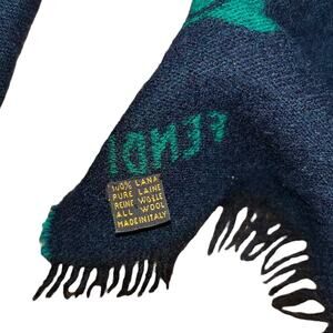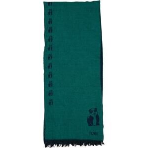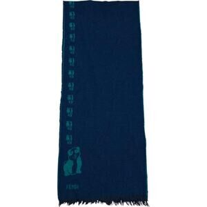 Rare Fendi wool scarf featuring green and navy dual-tone design with panda motif graphics throughout. Soft woven wool with fringe ends. Made in Italy. Excellent condition.
