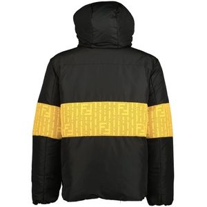 This black Fendi FF logo reversible puffer jacket is crafted in Italy. Characterized by its padded design, it features a high neck, detachable hood, long sleeves, two-way front zip fastening, and a contrast yellow panel through the centre with repeated tonal monogram detailing. The reverse is plain black with a large logo patch to the chest.