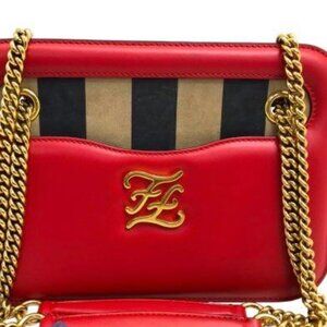 Structure: red Gusseted interior divided into two compartments by a stiff partition Internal and external pocket decorated with the FF Karligraphy logo Sliding chain shoulder strap Pequin striped details Gold-finish metalware