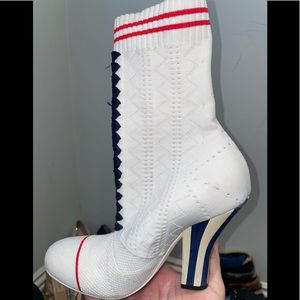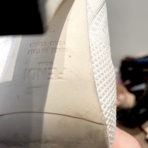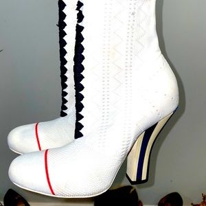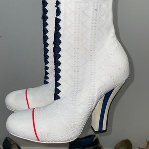 Like new only worn once sock booties from the runway the white was sold out quickly and Limited amount made. Soft sexy comfort FENDI is brought back. Women 37.5 -38 heel is 3.3 inches retail 1399 Just gif back Sandra and Cleaners as I noticed in the picture slight make up marks and bottoms so I’m wearing them just ones because they are leather I wanted to smooth out of it so I don’t want to see if anyone the pictures are as clear as I make them so you can see exactly what you’re getting but they look amazing now!
