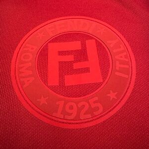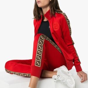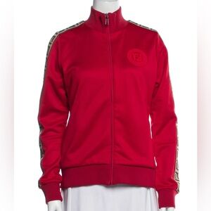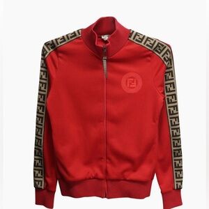 Vibrant red bomber jacket by Roma. Distinctive brown trim on sleeves. Ideal for a chic style.