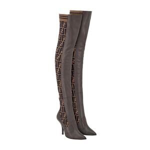 Fendi Rockoko Brown FF Logo Stretch Knit Sock Thigh High OTK Heel Pump Boot 35