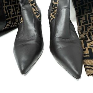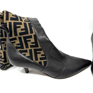 Fendi Rockoko FF Monogram Thigh-High Boots – Brown Knit & Leather, Size 7.5