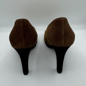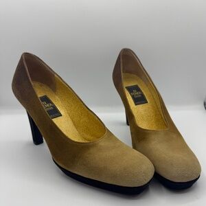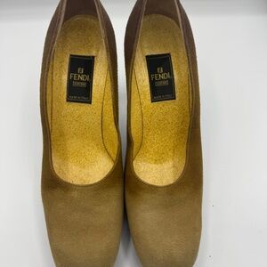 Fendi Scarpe Round-toe Platform heel in tan/brown hombre suede with 3 3/4” black suede heel size 7.5. These high fashion, elegant luxury heels will turn heads and stand out in a crowd. From the fashion house of Fendi made in Italy. Gorgeous neutral color. Gently used condition with slight scuffs on sole and evidence of a heel pad that has been removed from inside the left heel.