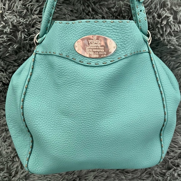 Fendi Selleria Leather Bucket Bag in teal. Beautiful stitching with durable, extremely soft leather. Leather cinching handles. 1 interior zip pocket. Center magnetic snap closure. Silver Fendi log plate on front and center of bag (with protective sticker still intact). Approx 13” wide, 16” tall (not including shoulder straps).