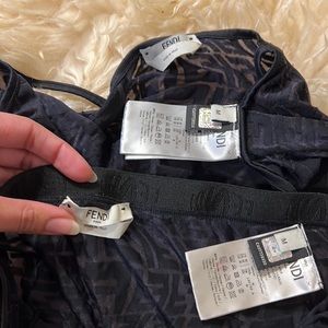 Fendi bralette and shorts set. Transparent fabric with logo pattern. Feels super silky and sexy when worn. I haven’t had this authenticated but the quality and the tags are pretty evident. I bought this but just don’t think I’ll ever wear it- hoping someone else will enjoy! Size medium, very stretchy. Unlined. Will throw in a Gucci *style* underset for free- also size medium but on the smaller end.