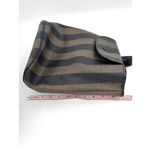Wear in the front or on the back. Features coated canvas on the exterior, brown interior fabric, and gold-tone hardware. Unisex bag.