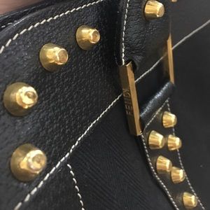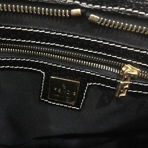 Black Canvas Tote with black leather trim and gold studs. Shoulder Drop is 6" Genuine Leather Fendi Handbag Perfect Condition. 15 IN. X 9 IN X 5 IN. Worn Once. 100% Authentic with original dust bag