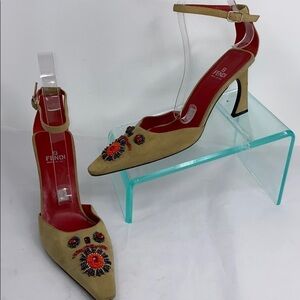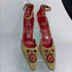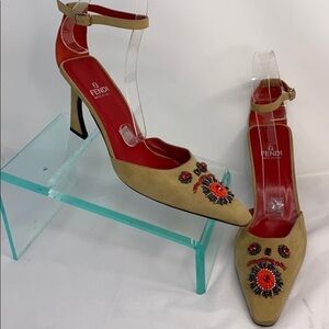 Fendi Sz 9.5M Beige Suede Beaded Ankle Strap Heels