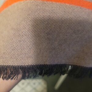 Stylish Fendi poncho. Features bold logo pattern. Tan and black with orange accents. Perfect for layering.