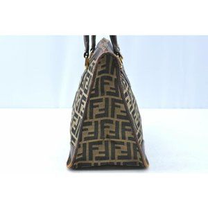 The bag is a large, top handle, satchel style purse with two hard, rolled leather handles. It is made of tobacco Zucco print canvas and brown leather. The hardware is brass and is signed as Fendi. It has a zip top closure with gold Fendi zipper fobs. On the front at the center, there is an embossed leather stamp with the FF logo.