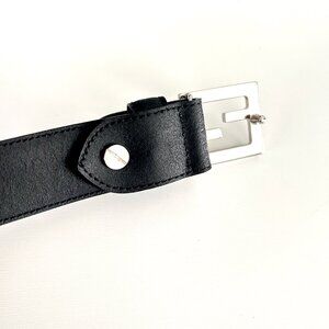 This vintage UNISEX Fendi silver tone squared FF logo is in excellent pre owned condition. Light to negligible scuffing and tarnishing on buckle; leather is like new. 1.25" Wide.