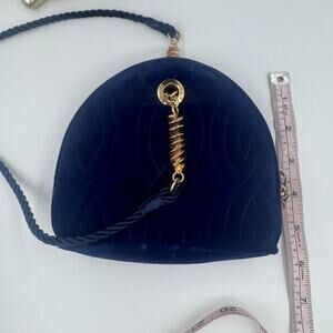 Elevate your collection with this rare Fendi vintage “Pasta” shoulder bag, featuring a structured round silhouette in plush navy velvet. The bag showcases Fendi’s signature embossed pattern and is accented with a striking gold-tone spiral zipper pull, resembling a fusilli pasta twist. Comes with a long navy rope strap for crossbody or shoulder wear. A true collector’s piece and conversation starter, perfect for vintage lovers and Fendi enthusiasts alike.