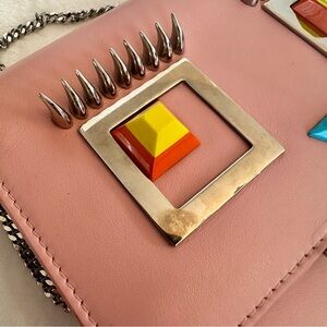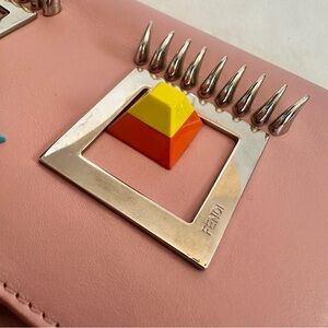 Add a playful touch to your outfit with this Fendi wallet on chain. Featuring a unique face motif, this pink bag is both stylish and fun. Perfect for any occasion or being on the run. Dust bag included. Features six credit card compartments. Zipper compartment. Leather, cloth and suede lining. Magnetic snap closure.