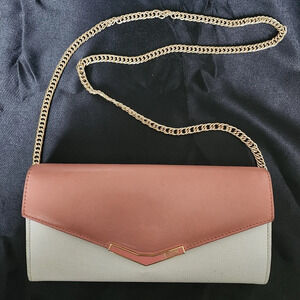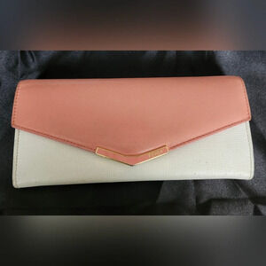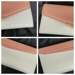 This stylish wallet is crafted of flamingo pink and white vitello calfskin leather. The front flap opens to a matching leather interior with a panel of card slots, billfolds, and zipper compartment. This is a marvelous wallet, ideal for everyday use. Looks great as a wallet on chain, unbranded chain included. All signs of wear shown in pictures, it is used but still in good condition.