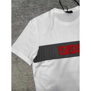 Fendi White Black Mesh Stripe Red FF Logo Short Sleeve Cotton T-Shirt Medium M