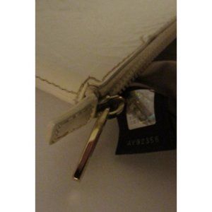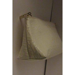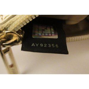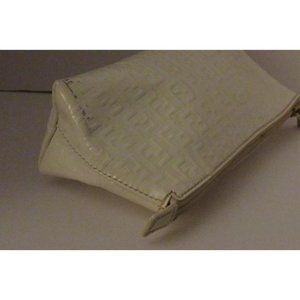 For sale is a Fendi, white Zucchino print embossed patent leather, top zip clutch style purse or cosmetic bag! This is the perfect size clutch for a night out or to pair with a larger bag and the Fendi logo print is the hottest print of the year! The bag is by Fendi in one of its best known designs- the small logo print or the Zucchino print embossed in patent leather! It has a top zip style closure with an XL gold Fendi FF logo. 9"L x 3"W x 4.5"H. All measurements are approximate. LP*