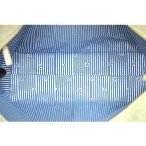 Interior is in excellent condition with a matching white with blue fabric lining. The lining has a logo print throughout and is made of a silky, very clean fabric. There is a zip pocket on the interior. This would be the perfect size to use as an everyday purse or for a tablet or laptop bag!
