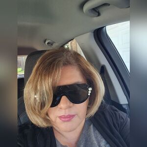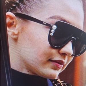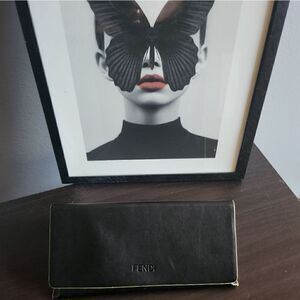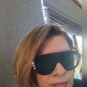 Fendi sunglasses in black with pearl accent. Very contemporary with the top of the glasses being frame less. Barely used, in excellent condition, cones with card, case, and cleaning cloth. Made in Italy.