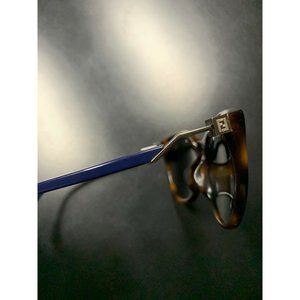 Awesome pair of Havanna Blue sunglasses ( FF 0209/f/s) from Fendi. They have a rounded shape with dark grey gradient lenses. The blue arms are really unique-they have a great geometric design that really pops against the brown tortoiseshell frames.