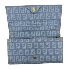 Fendi Zucca FF Jacquard in Shades of Blue Long Wallet. It's made of Denim. There are card slots in the top flap then on the bottom, 2 thin Slip Pockets (one at front edge and one in very back) , 2 Larger compartments and a zippered coin pouch in the middle. Fendi Logo Snap Closure.