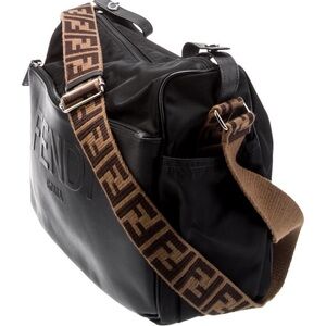 Elegant Fendi Zucca FF Nilon bag in sleek black. Features a distinctive brown strap with logo pattern. Ideal for stylish functionality.