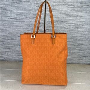 Chic Fendi tote in a bold orange hue. Features signature logo pattern. Ideal for everyday use. Please refer to pictures for best detail, overall in great condition, inside is clean, no sign tears of rips but does shows typical signs of use, one handle is cracked at hardware (please see picture) does not stop the functionality and overall a nice bag to add to the collection.