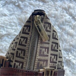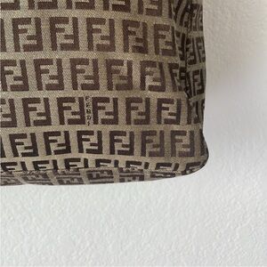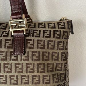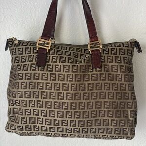This tote is the signature logo tote. Tan and brown. Handles are in excellent used condition. Slight wear on hardware. Measurements are 13" L x 10" H x 5" W.