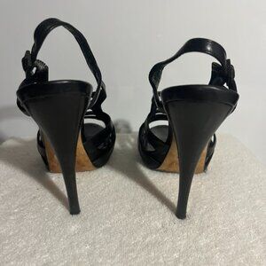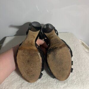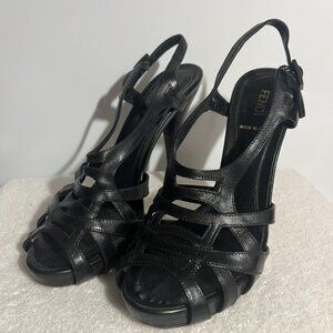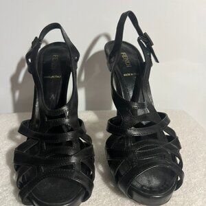 Fendi Cage sandals. Hidden 1 inch platform with 5 inch heel. Gently worn. EU 37.5 translates to 7. Great with jeans or a sexy cocktail dress. Dress up or dress down. Wooden stacked heels with side buckled closure. Offers welcome!