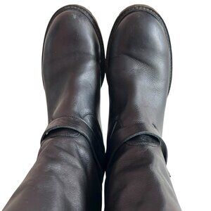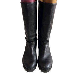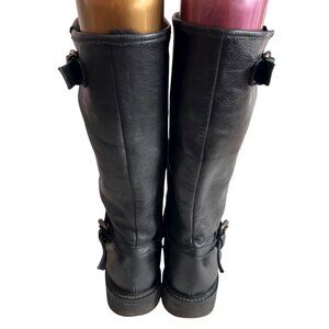 Fendi motorcycle boots, black leather, rabbit fur lining, pull on, round toe, chunky rubber soles, 1.5" low block heel, two straps and buckles, made in Italy, EU 40 / US women's 10, 12" tall mid calf shaft, 14" opening circumference, outsole: 11 1/8", preowned and shows wear on the soles, heel drag, scuffs and wear on the exterior - see photos