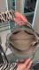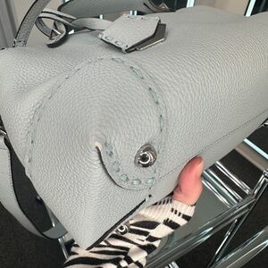 Light blue grained leather, silver-tone hardware, tonal leather stitching detail, detachable adjustable crossbody strap, dual flat top handles, top zipper, canvas lining, single interior zipped compartment, dual interior open pockets