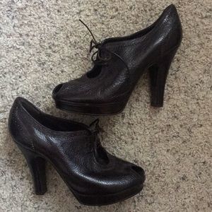 Dark brown leather Oxford heel with platform at toe and 4” heel