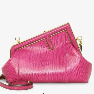 Small Fendi First bag made of exquisite fuchsia karung leather with oversized F metal clasp bound in tone-on-tone karung leather.