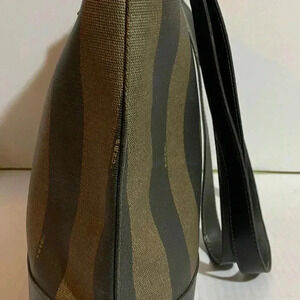 Fendi vintage pequin color block pattern shoulder handbag with gold tone hardware with main compartment 1 zip pocket closure at interior wall zip closure at top lining have some creasing minor cracks At strap hight 11” width 17.25” depth 4” strap drop 13.5” The dimensions are based on approximately measurements before placing an order please check take a moment to view all photos using feature for a closer look