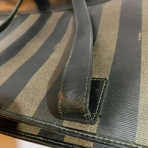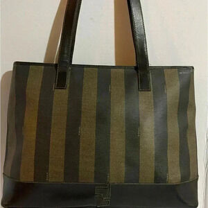 Fendi vintage pequin color block pattern shoulder handbag with gold tone hardware with main compartment 1 zip pocket closure at interior wall zip closure at top lining have some creasing minor cracks At strap hight 11” width 17.25” depth 4” strap drop 13.5” The dimensions are based on approximately measurements before placing an order please check take a moment to view all photos using feature for a closer look